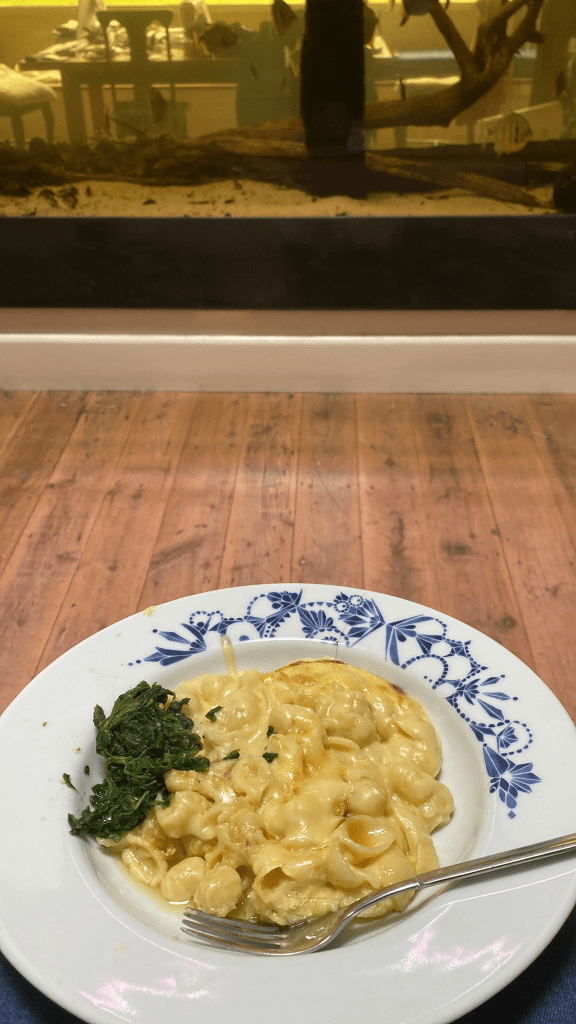 First, bring a pot of water to the boil and add two or three teaspoons of salt and cook the pasta. Preheat the oven to 180°C. Drain the pasta and leave it to one side while you make the sauce. In the still warm pasta pot on a low flame, melt the butter and add the flour, stirring to combine. Once the butter is melted add the can of soup and combine. If using homemade soup, it will be more watery, so do not add it all at once, dribble it in slowly while stirring continuously. The aim is to make a bechamel sauce that thickens slowly. Add the whole milk slowly and pepper to taste. Once it is as thick as you would like, take the sauce off the flame and add the cheese. Stir together and add the cooked pasta. Pour into a 20cm x 20cm (8″ x 12″) baking dish. Smooth the top and lie the slices of cheese over the top, not touching, maybe a centimetre apart. Bake for 40 minutes, remove from oven and let cool for at least ten minutes before serving (the cheese is MOLTEN LAVA). Serve with lima beans, baby peas or spinach.